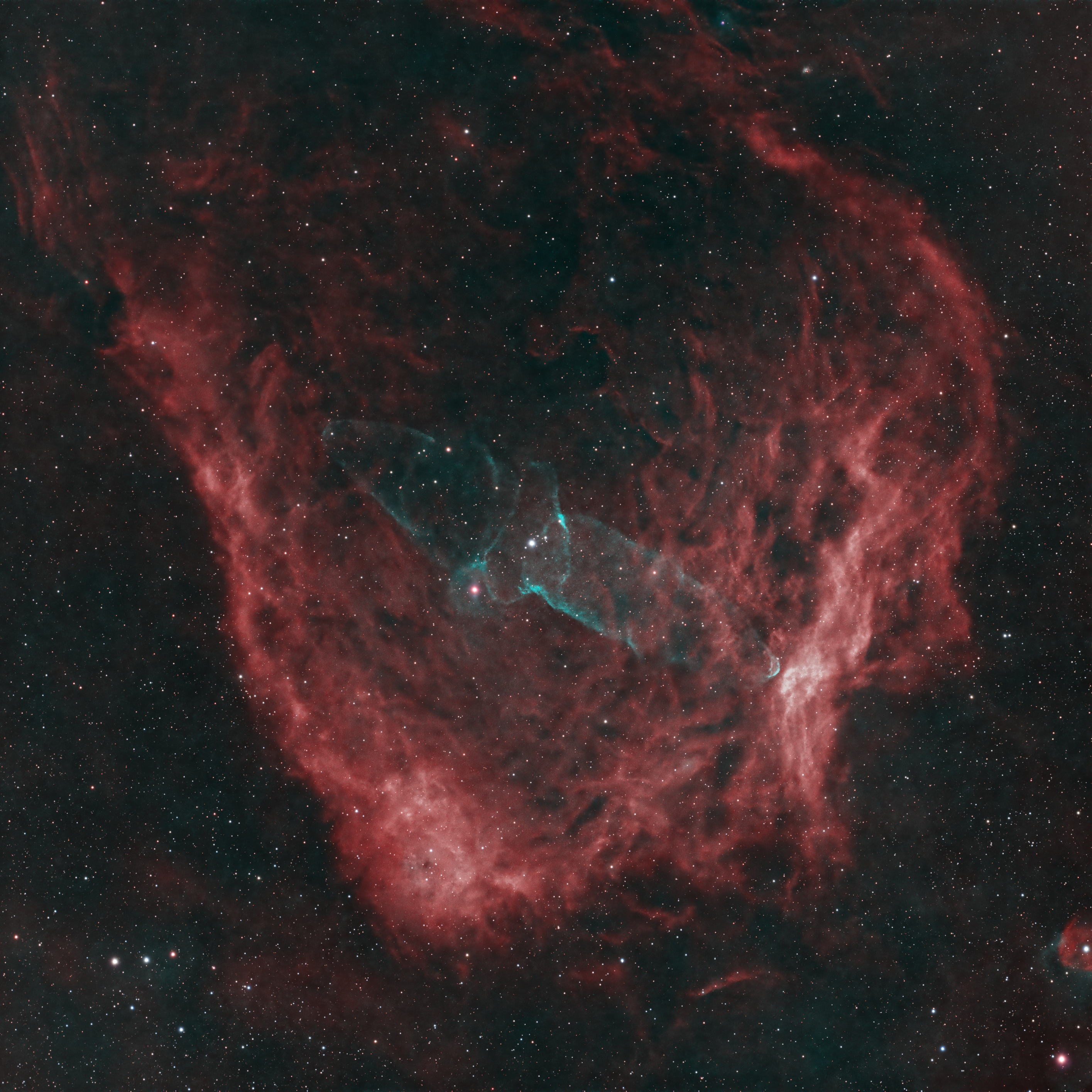 Flying Bat, Sh2-129, and Squid Nebulae, Ou 4, in Cephus. This has been a long term project started last fall. Updated with another night's data. About 2/3 of the data is from Bad Wolf Ranch under Bortle 4 skies, and 11 hours of #NBOSC dataunder Bortle 7 Austin Skies. 4 hours of broadband color data was used for star colors. In total 33 hours of exposures on 2024-10-10 to 2045-07-30, rendered in an HOO palate.