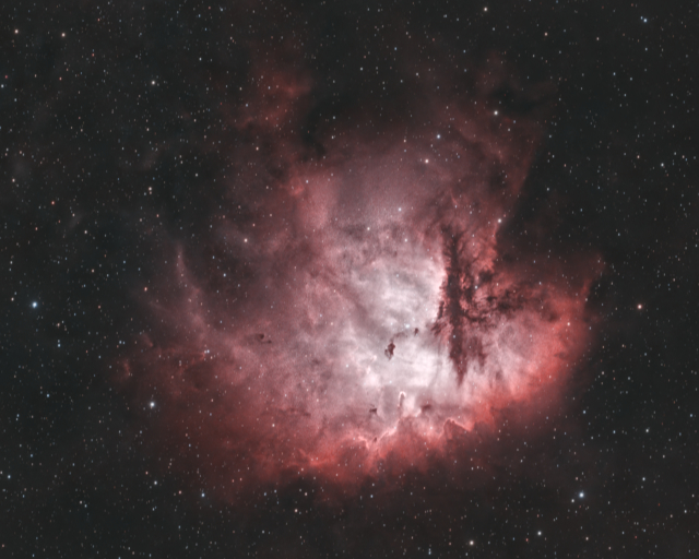 Below is my image from a year ago. The additional data and better stretching and handling of the HOO palette improved the result. With my dual NB filter Oxygen III data goes into both the blue and green channel. The blue signal is weaker and noiser so I combine both signals for both blue and green. For many of these emission nebulae the Hydrogen alpha signal is much stronger than Oxygen. Adding a bit of the red channel, into the green channel brings out the Oxygen signal where it would be swamped out in a straight HOO palette rendering. I've started labeling this as a #HOhO palette.