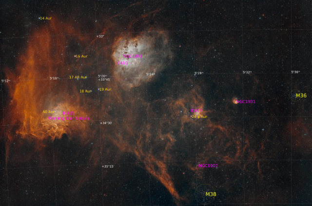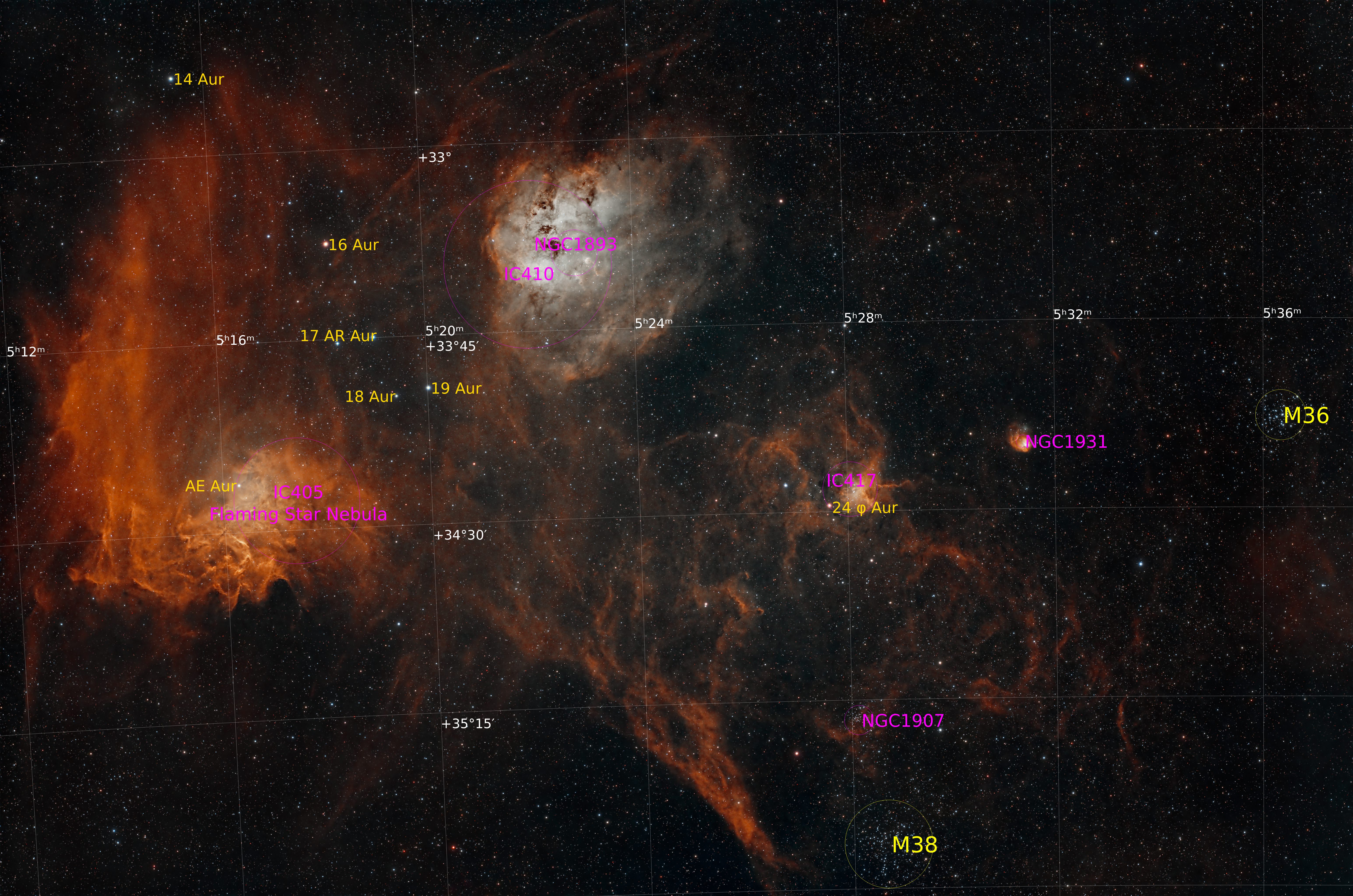 Flaming Star Nebula (IC405) in Auriga with IC410/NGC1893, the Starfish (M38), and Pinwheel (M36) clusters. This wide view shows this ensamble of beautiful objects in context. This is not an SHO image, but an HOO palette image where a bit of the H signal is added to the Oxygen signal in the Green channel. I call this an HOhO palette ;-)