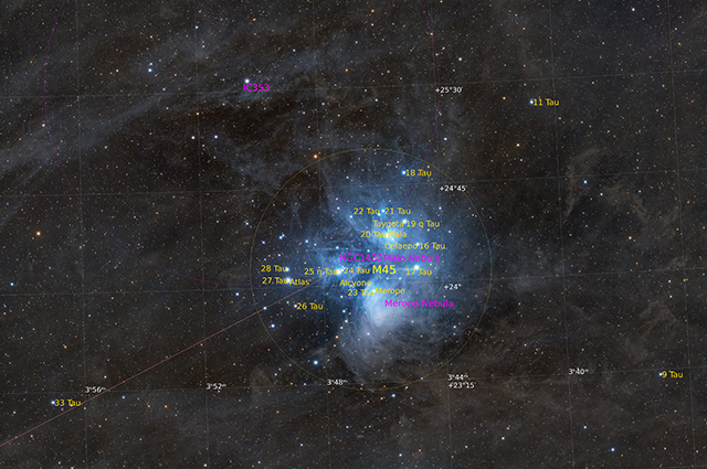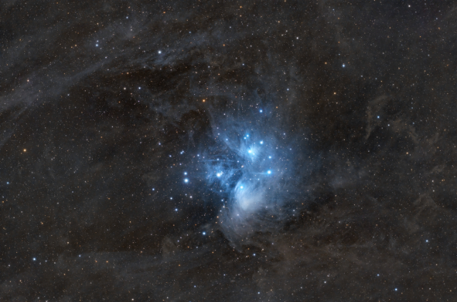 The Pleiades, M45, is an open star cluster asterism only 17.5 LY away in the constellation Taurus. It has been recoginzed and recorded since prehistoric times. 5 hours of broadband exposures on 2015-11-14 UT under Bortle 3 skies from Bad Wolf Ranch, Texas.