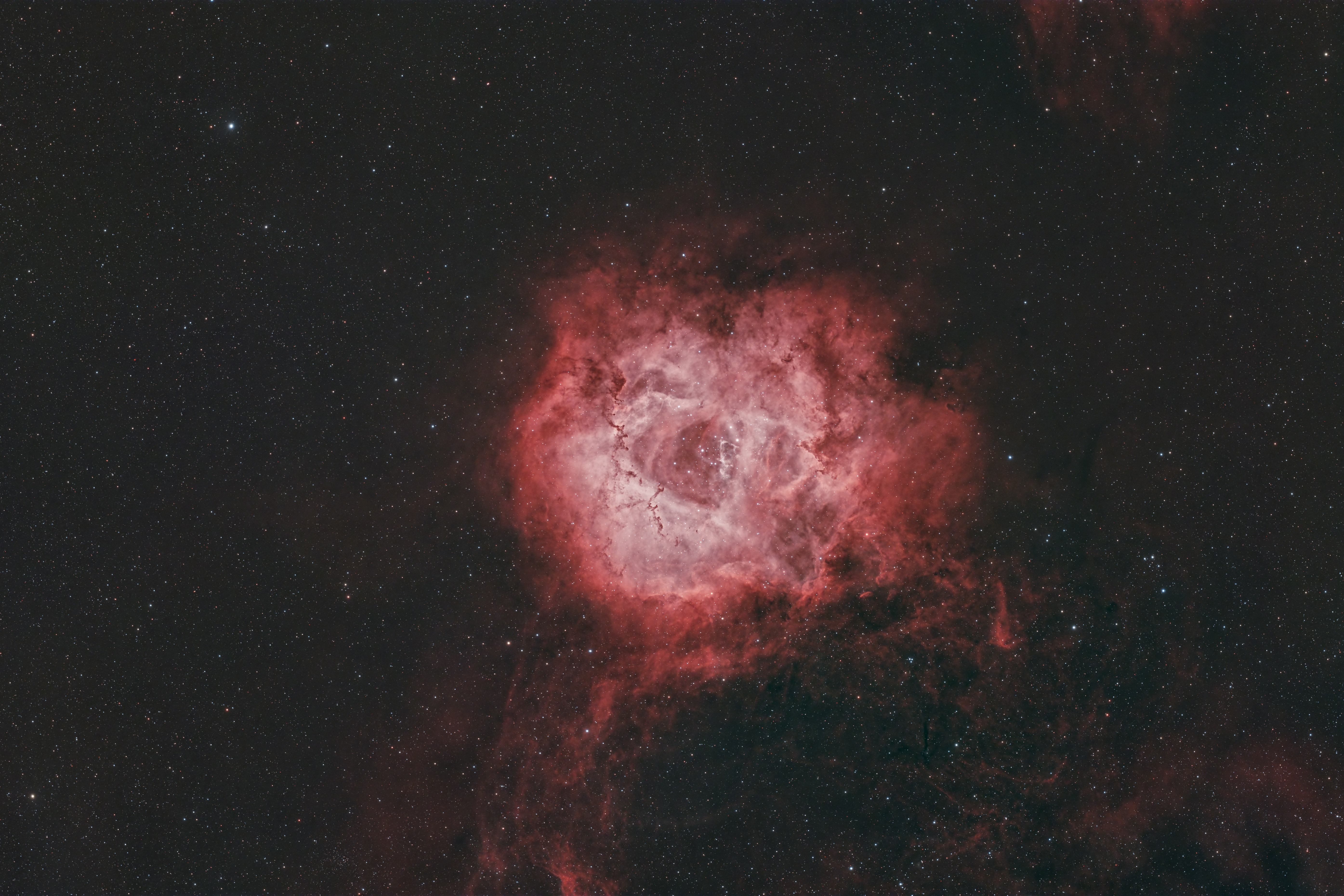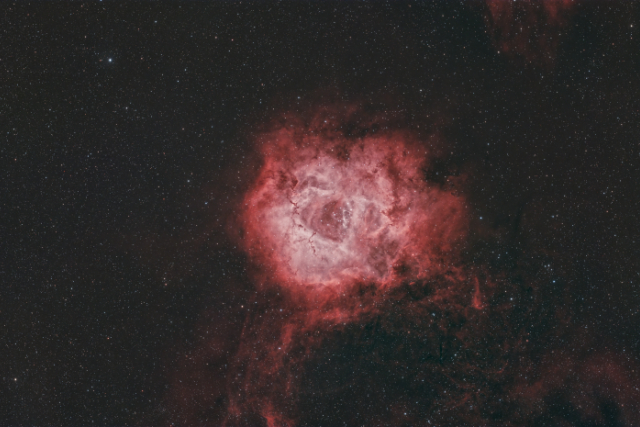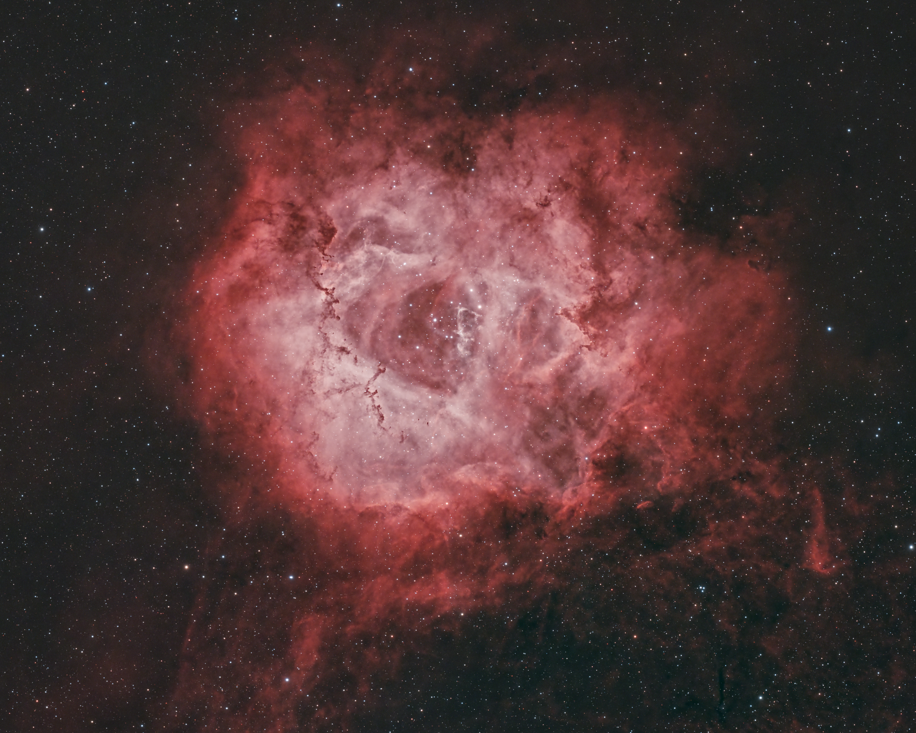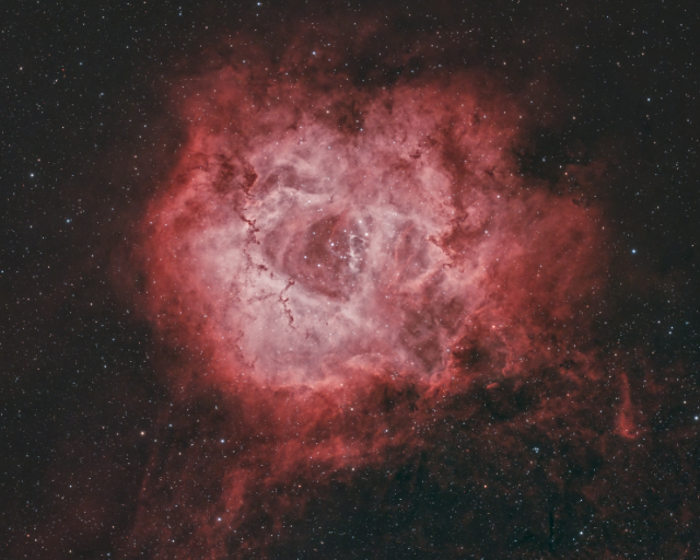 The Rosette Nebula, NGC 2237. 10 hours of #NBOSC exposures on 2025-11-25>26 under Bortle 7 skies from Austin, Texas, rendered in a HOO palate. This was my after midnight image after my Cassiopeia image disappeared behind my neighbors tree. I plan to get some more data with my O3-S2 filter and produce a SHO image later.