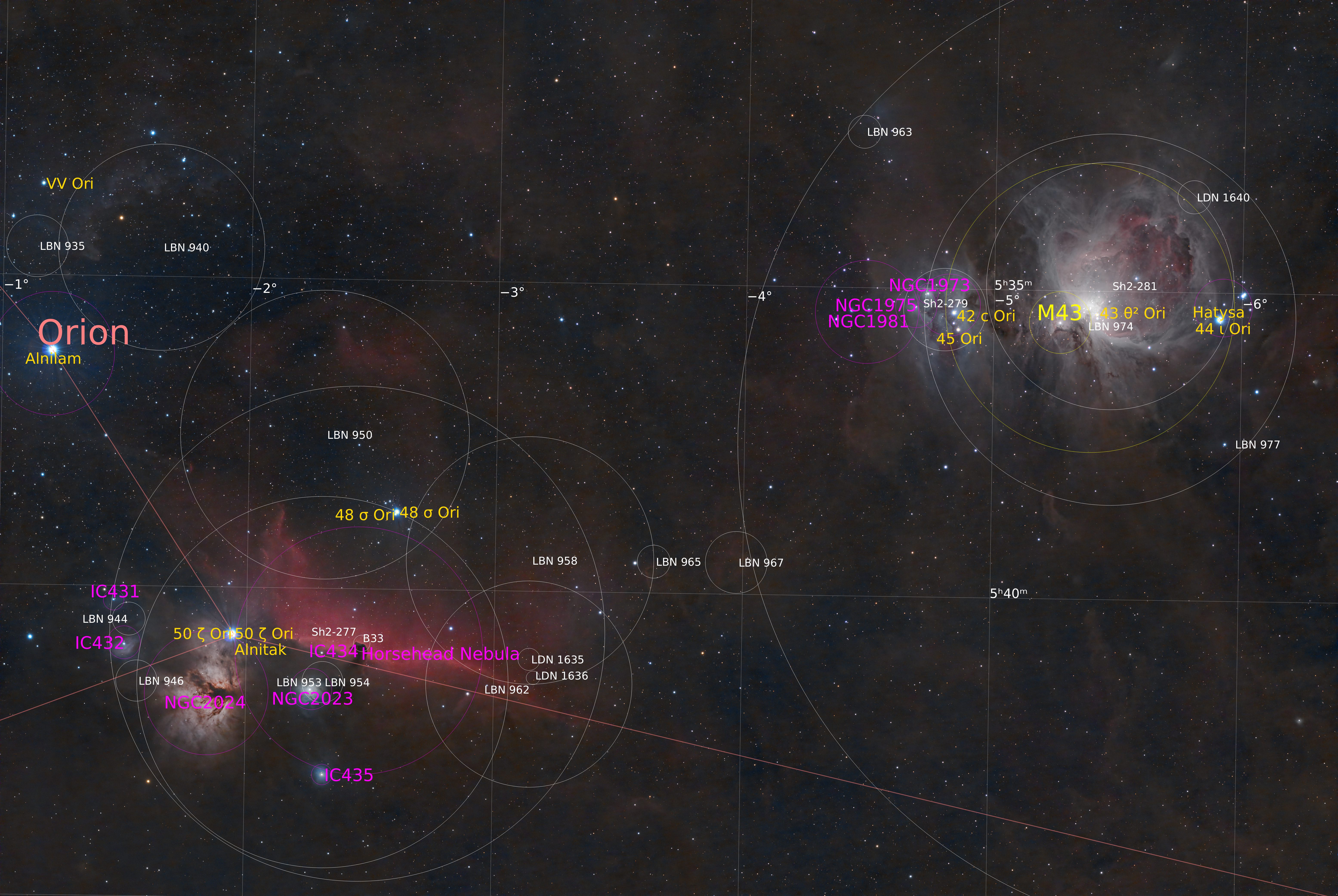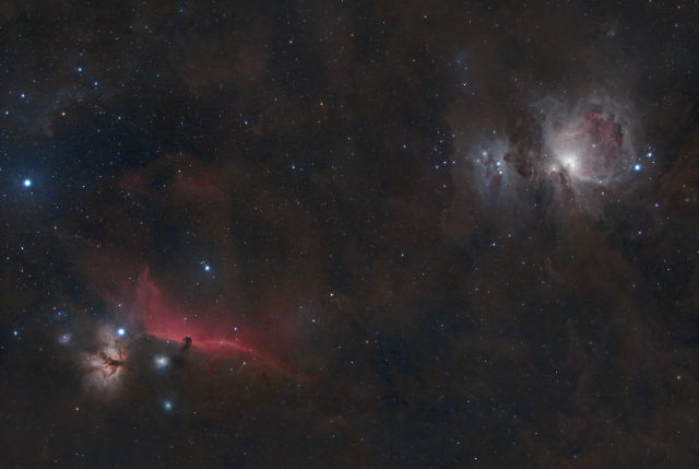 Alnitak, Anilam, the Flame (NGC2024), Horsehead (IC434), Running Man (Sh2-279) and Great Nebula of Orion (M42). 4 hours of #NBOSC exposures on 2025-12-12 under Bortle 3 skies from Bad Wolf Ranch, Texas. I've made a similar image as a three tile mosaic with my ASI533. It was great being able to capture this beautiful expanse in a single image. Many think that you need to use HDR multiple exposure time techniques to keep the core of M42 from blowing out. With careful stretching it was no problem with the over 500 30" exosures through this f/5 telescope.
