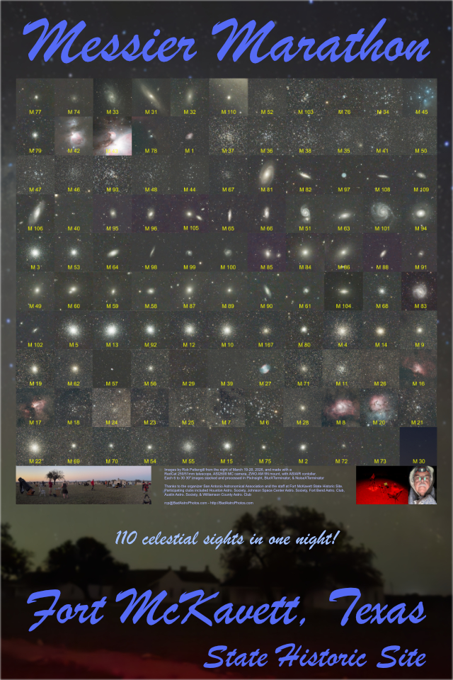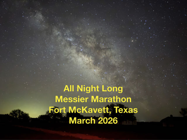 A Messier Marathon, viewing or imaging all 110 objects in the catalog, is possible only a couple of weeks during the year. Mid to late March usually the best. Success requires near ideal weather and location. Those came together March 19-22 at the Fort McKavett State Historic Site in an event organized by the San Antonio Astronomical Association with participants from many Texas clubs.